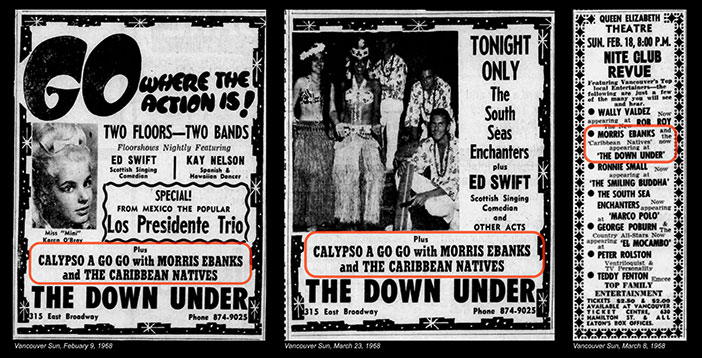 “Morris Ebanks and The Caribbean Natives” were a regular fixture at The Down Under, at 315 East Broadway. The building the housed the venue still stands. Ebanks - along with other notable Vancouver performers - also played the Queen Elizabeth Theatre as part of a “Nite Club Revue” night in 1968.